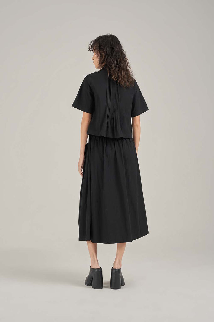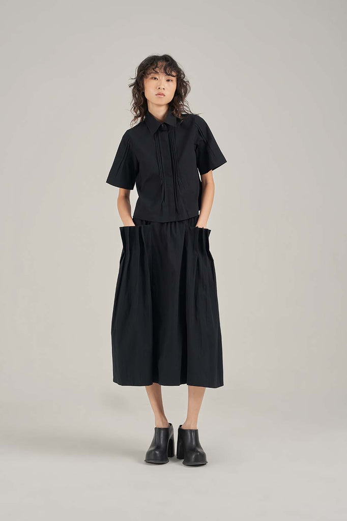 Jazlyn Skirt by SABRINAGOH. Crafted from 100% seersucker cotton, this A-line skirt features a gentle flare and an elasticated back waist for added comfort. Designed with a pouch pocket highlighted by neat pintuck details along the pocket opening. Pair it with the Winnie Shirt for a coordinated set look.
