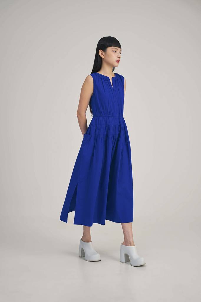 Crafted from 100% seersucker cotton, the Ashe Dress is lightweight, breathable, and effortlessly chic. This sleeveless maxi dress features a tiered silhouette for graceful movement. The front zipper closure allows for multiple styling options—wear it as a V-neck for a modern edge or a round neck for a classic touch. Finished with a side pouch pocket, it blends versatility with everyday elegance.