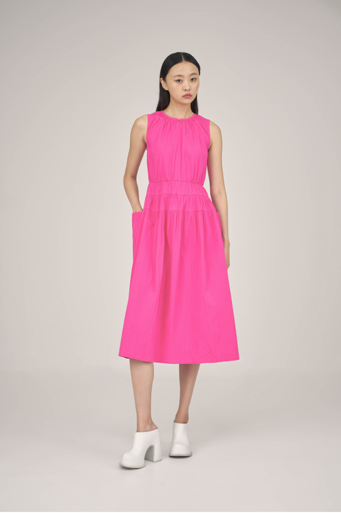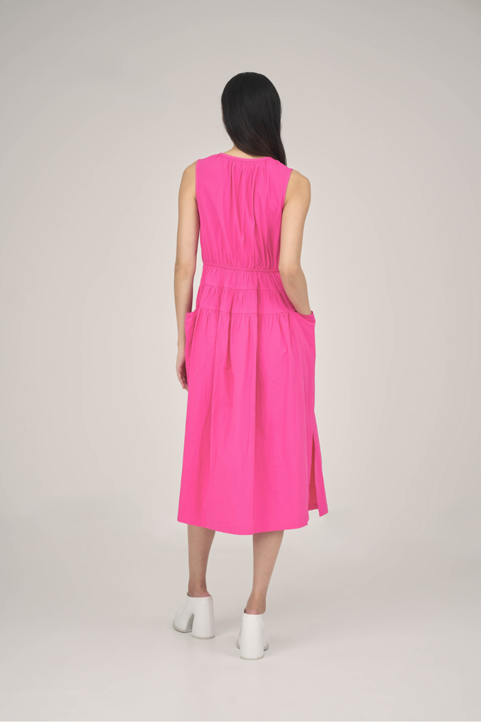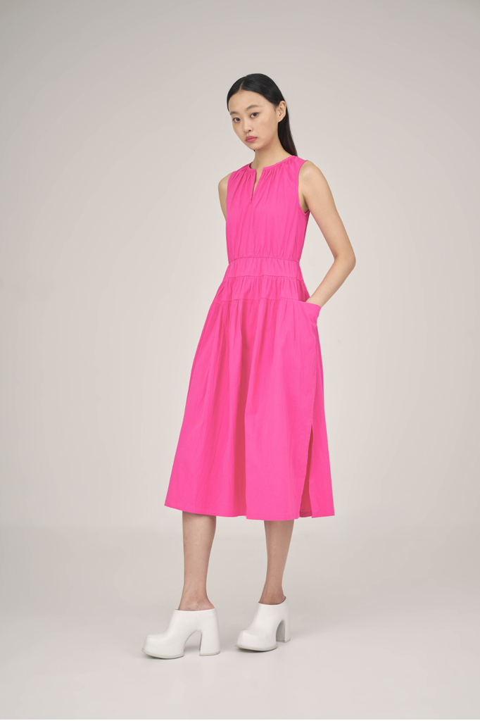 Crafted from 100% seersucker cotton, the Ashe Dress is lightweight, breathable, and effortlessly chic. This sleeveless maxi dress features a tiered silhouette for graceful movement. The front zipper closure allows for multiple styling options—wear it as a V-neck for a modern edge or a round neck for a classic touch. Finished with a side pouch pocket, it blends versatility with everyday elegance.