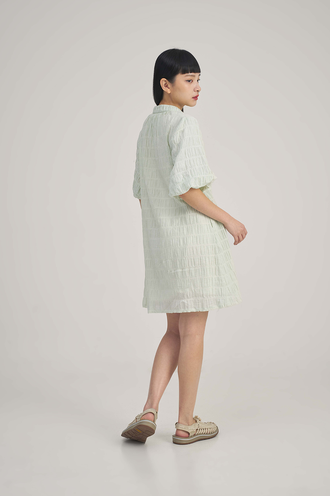Effortlessly refined, the Aurelia Dress is crafted from a cotton-spandex blend with a ruched seersucker texture that offers both comfort and gentle structure. Fine stripe detailing adds a subtle touch of elegance, perfect for those who appreciate understated design. Featuring a practical V-neckline framed by a ruched collar stand and soft puff sleeves, this knee-length silhouette brings a fresh take on everyday dressing. Complete with side pockets for ease and functionality.