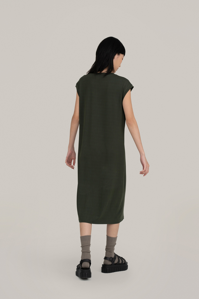 SABRINAGOH's Vat dress is a sleeveless, midi length in a minimalist style. It's made from a soft, lightweight blend of modal jersey that adds softness to the fluid silhouette. Style yours with sandals.