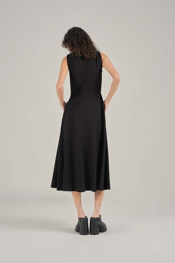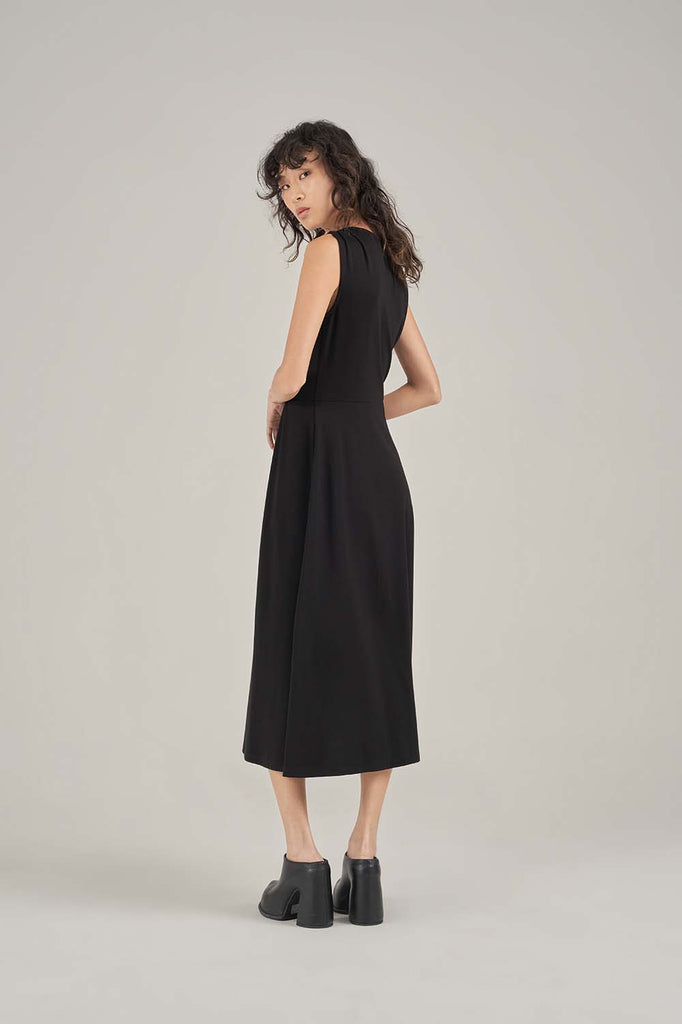 The Maureen Dress is a midi length sleeveless, fit-and-flare designed for effortless elegance. Crafted with twisted tuck details along the shoulder seams, chest and waistline, featuring a graceful drape forming a defined yet feminine look. Finished with a classic crew neckline and functional side pockets, a versatile piece for every season.