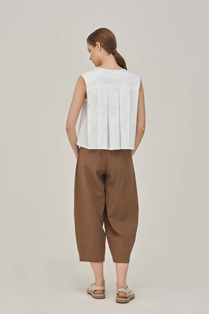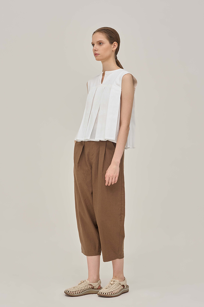 Baylin Box Pleat Top, crafted from a cotton-spandex blend, combines comfort with sophisticated style. Featuring a unique seersucker texture, this sleeveless top boasts elegant box pleat details and a stylish slit neckline opening, creating a modern and flattering silhouette.