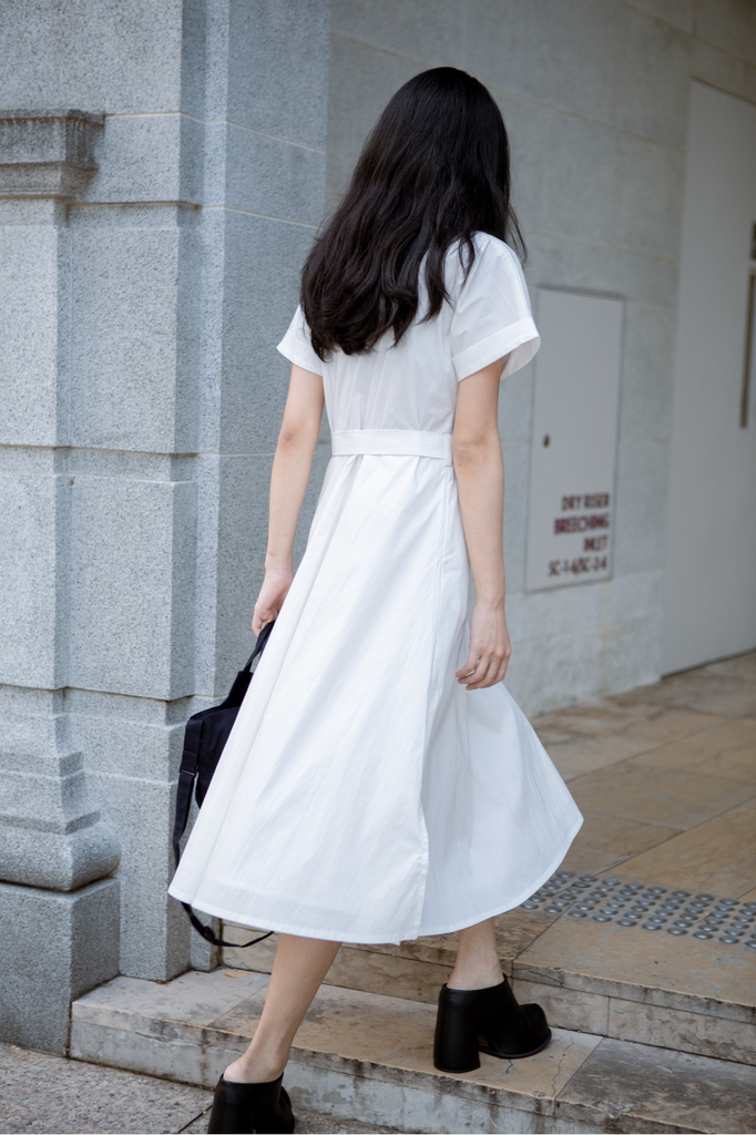 Sabrina Goh's Brinley shirt dress is made from cotton nylon spandex in fit and flare shape. Perfect for work, wear yours with a belt and platform sandals.