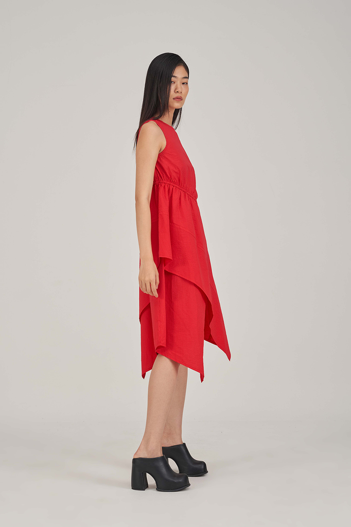 Crafted from 100% seersucker cotton, the Yilfey Dress offers a lightweight and textured feel that's perfect for warm days. Its sleeveless design and unique diagonal cut create a striking silhouette, complemented by an handkerchief hemline for a modern edge. Featuring subtle elastic detailing on one side of the waist, this dress provides both comfort and shape. Complete with in-seam pockets, it's as practical as it is stylish—making it a go-to for effortless, everyday wear.